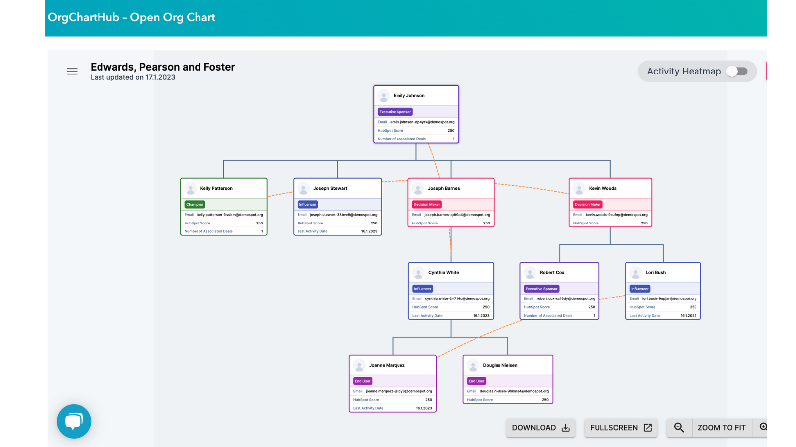 Overall, Org Chart Hub is a powerful tool for visualizing customer organizations and relationships within HubSpot, making it easier to understand the decision-making dynamics of a customer organization and align sales and marketing activities accordingly. It syncs with HubSpot, which is making it a seamless addition to your sales and marketing strategy.